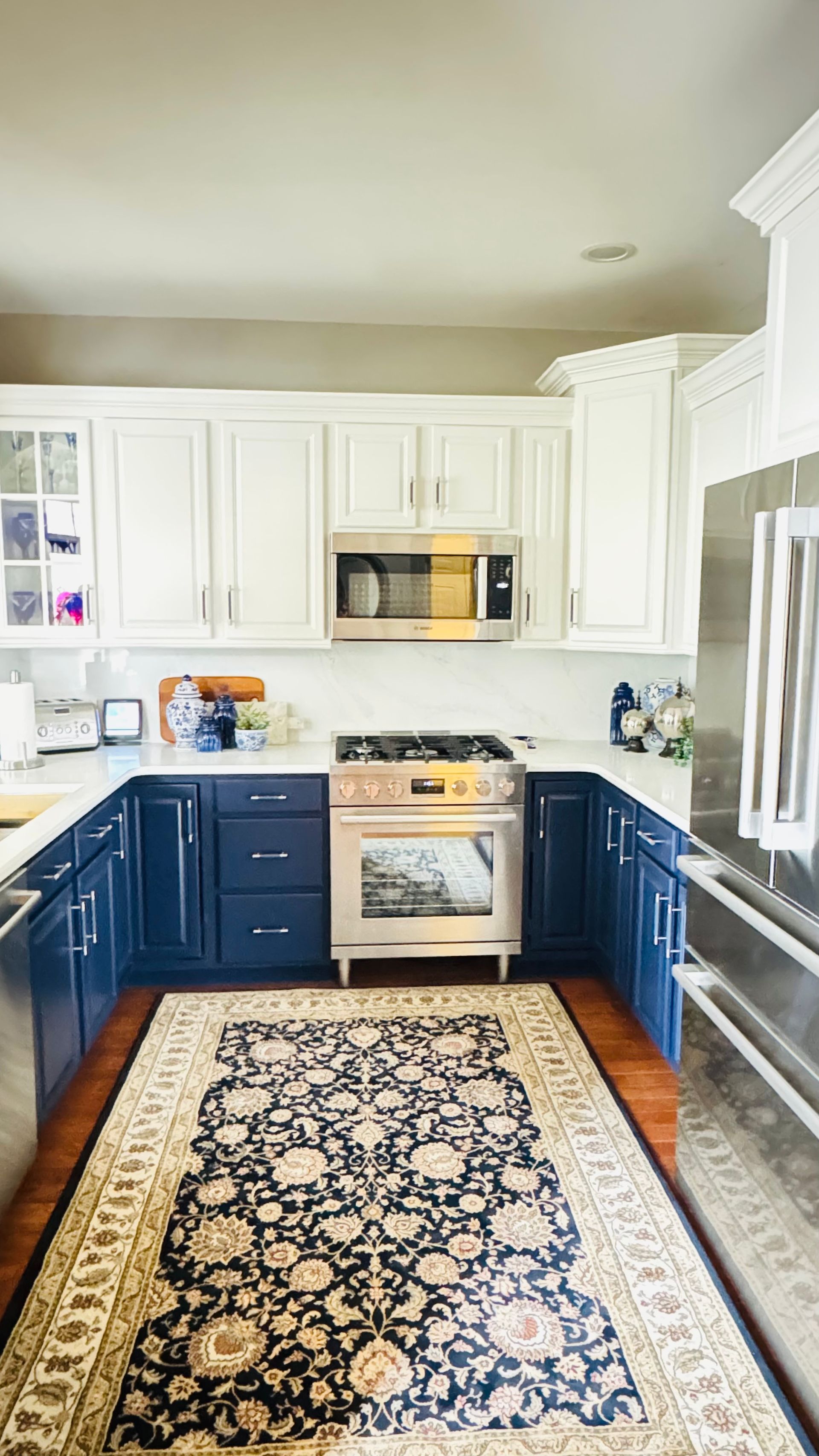 Our client, a retiree and proud grandmother, wanted a kitchen that felt more like her. While her existing space had decent bones, it featured standard white builder-grade cabinets, no crown moulding, and a two-tiered counter layout that made entertaining difficult. She dreamed of a kitchen that was warm, welcoming, and fit her favorite color: blue.